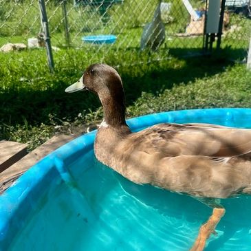 Cheese the Duck joined our rescue from a loving family who wanted him to have companionship after the loss of his longtime partner, Quackers. Here, Cheese has found a new flock and fast friends in our two Pekin ducks, Fiona and Luke. He spends his days paddling, chatting, and soaking up the sunshine, living his best life surrounded by feathered friends.