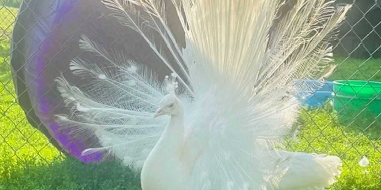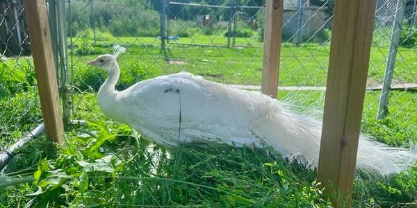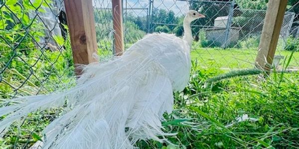 Meet Gilligan, our gorgeous white peacock! He came to us from southern Illinois and joined us as a partner for Skipper. Gilligan's snowy white plumage isn't due to albinism, but a condition called leucism. It's a genetic trait that prevents pigment in his feathers, but still enables him to keep his dark eyes. Stay tuned for more adventures with Skipper and Gilligan!